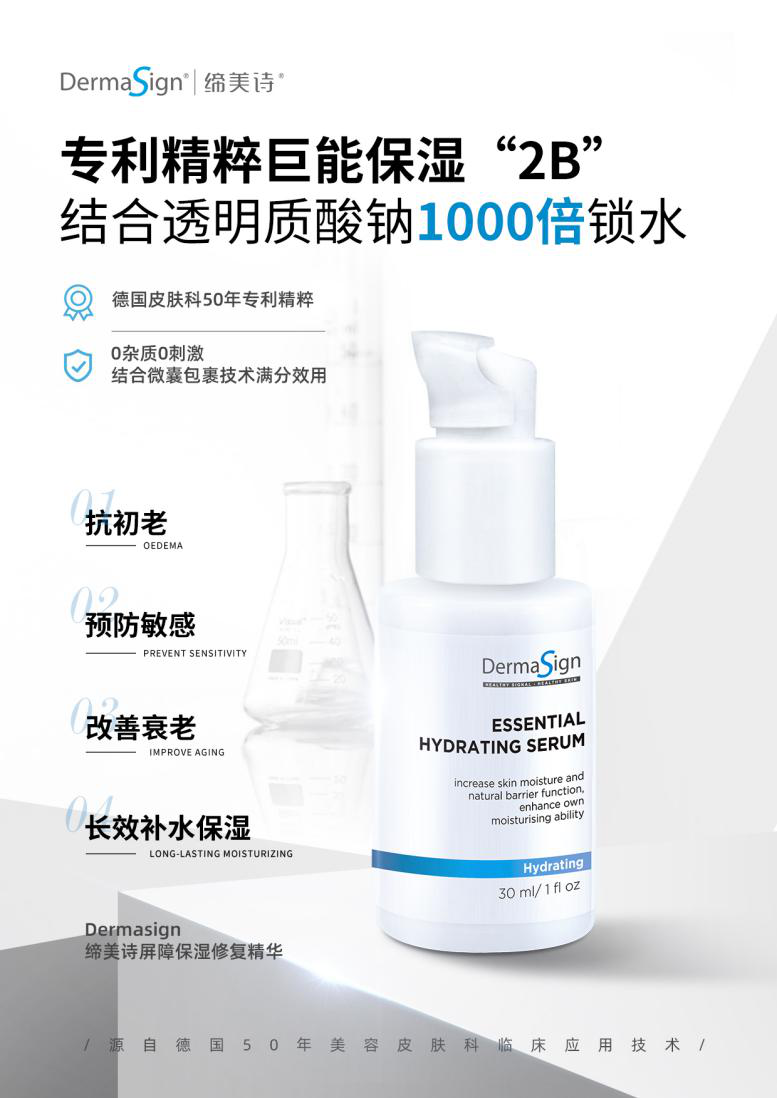 DermaSign缔美诗屏障保湿修复精华堪称巨能补水库,它以专利精培的维他命B5结合烟酰胺,1000倍锁水因子透明质酸钠给皮肤充足水养分,对于干皮、术后亟待修护的肌肤来说,DermaSign缔美诗屏障保湿修复精华堪比敷用了贵妇面膜的即刻体验感,皮肤细嫩光泽,第二天,第三天,坚持使用,皮肤会越来越水嘭嘭。因此它也是抗老的必备精华之一。维他命B5、烟酰胺和DermaSign多效护肤基础乳中的羟基酪醇配方、神经酰胺、角鲨烷等等有效成分不仅能充足补充皮肤认可的脂质,还能深入真皮层刺激细胞增殖,拉动全新的健康的系统作业,让皮肤再生年轻力。
